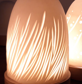 - Photophores (travail de finesse sur porcelaine coulée ou à la plaque, souvent incrustés de végétaux) afin de jouer avec la lumière des bougies.